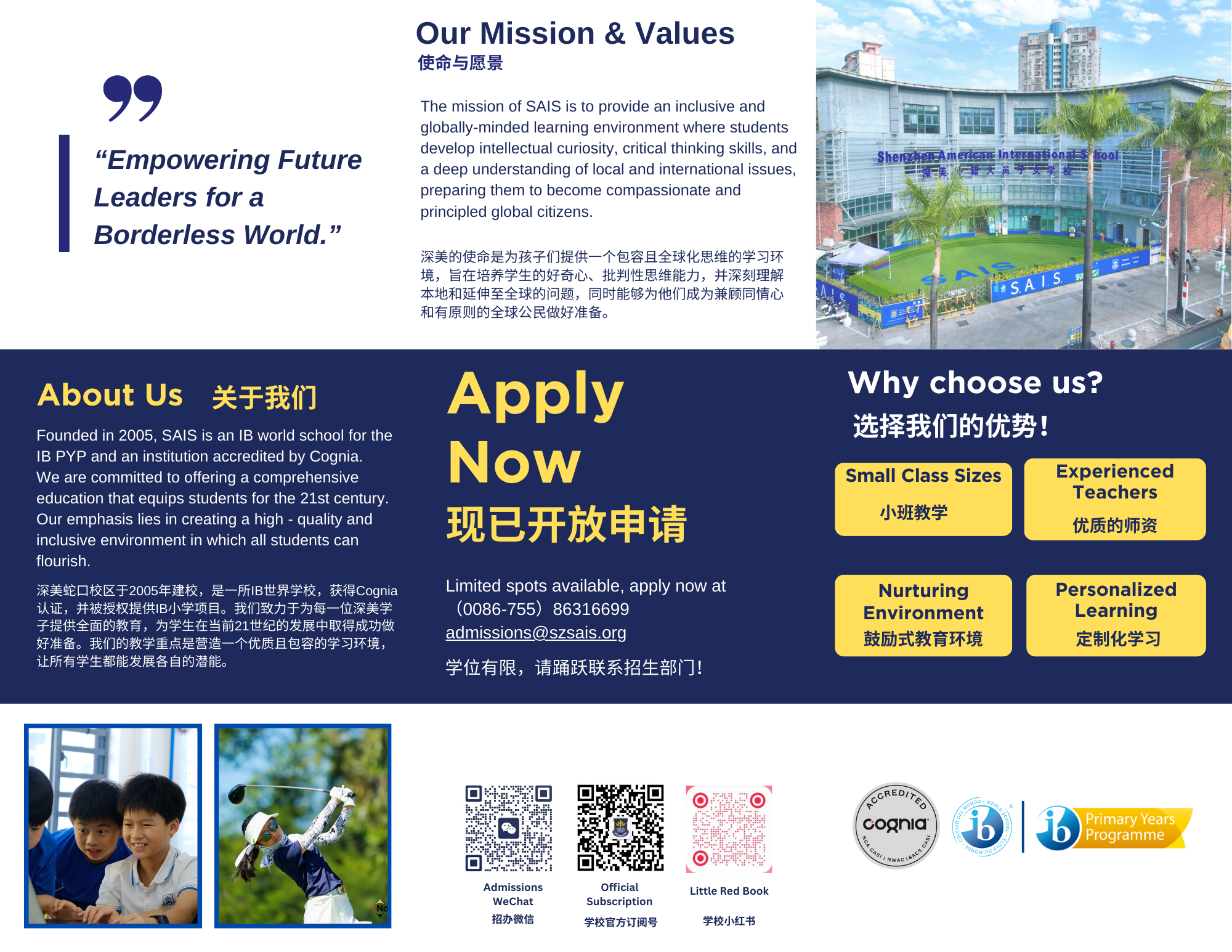 Primary School: Welcome to the Primary School section at Shenzhen American International School, where we cultivate a dynamic and engaging learning environment for our students. As an IB world school, we integrate the IB philosophy with the rigor of the Common Core Standards to provide a comprehensive and well-rounded education. Our full-time foreign homeroom teachers bring diverse perspectives and global insights, enriching our students’ learning experiences and fostering a multicultural understanding.