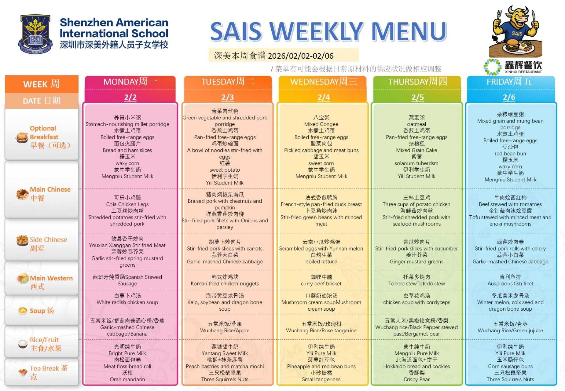 Our school is proud to collaborate with Xinhui as our school meal provider. Xinhui specializes in offering high-quality, nutritious catering services to schools, offices, and factories. They possess extensive experience in school canteen operations and are dedicated to providing delicious and balanced meals for our students. By sourcing fresh ingredients directly from farms and maintaining tight control over the supply chain, they ensure that every meal meets the highest standards.